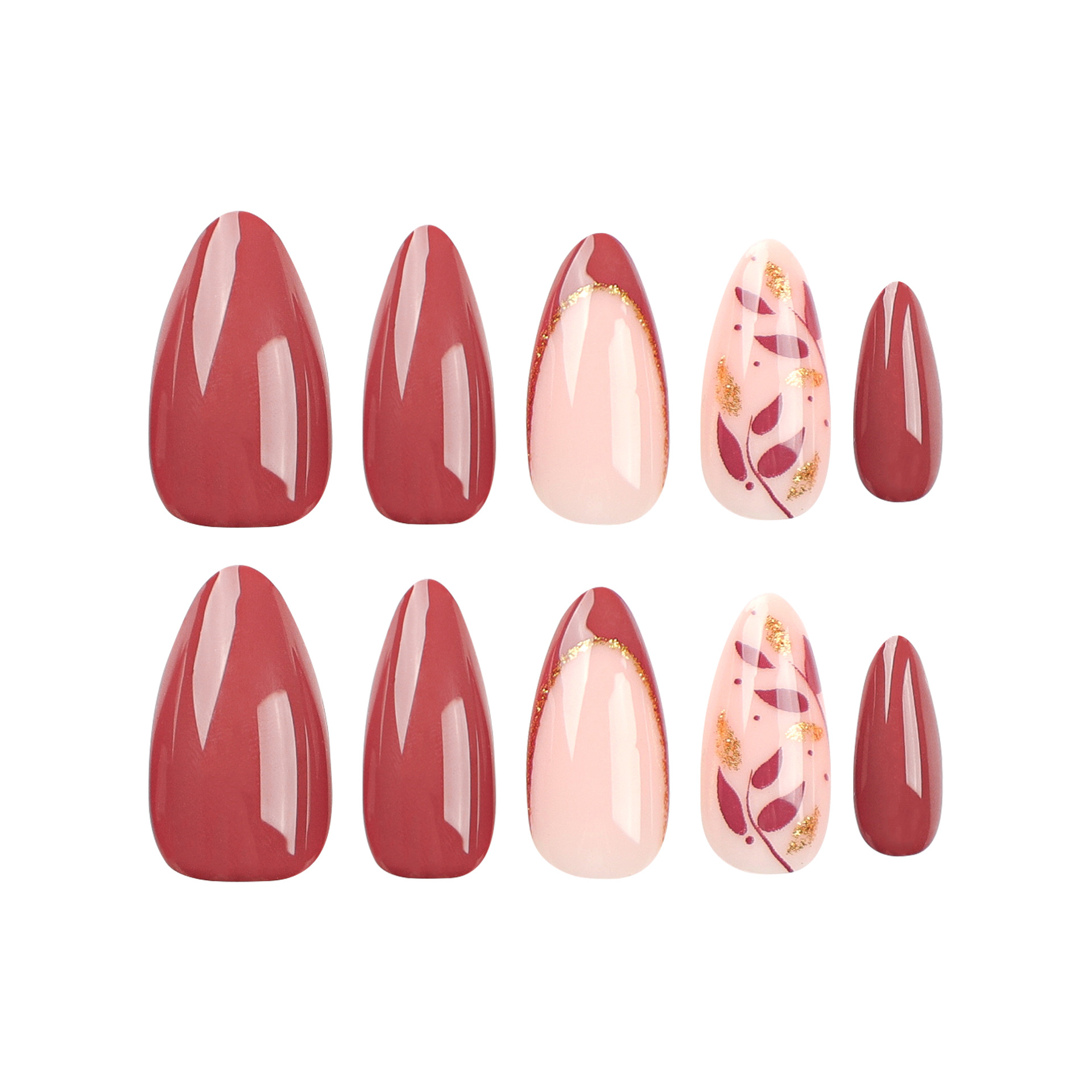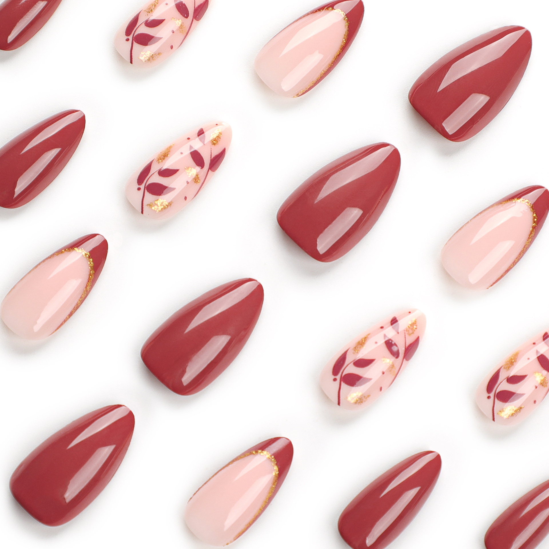 法式酒红色杏仁甲美甲穿戴甲片小红书简约树叶指甲片指甲贴甲片 数量