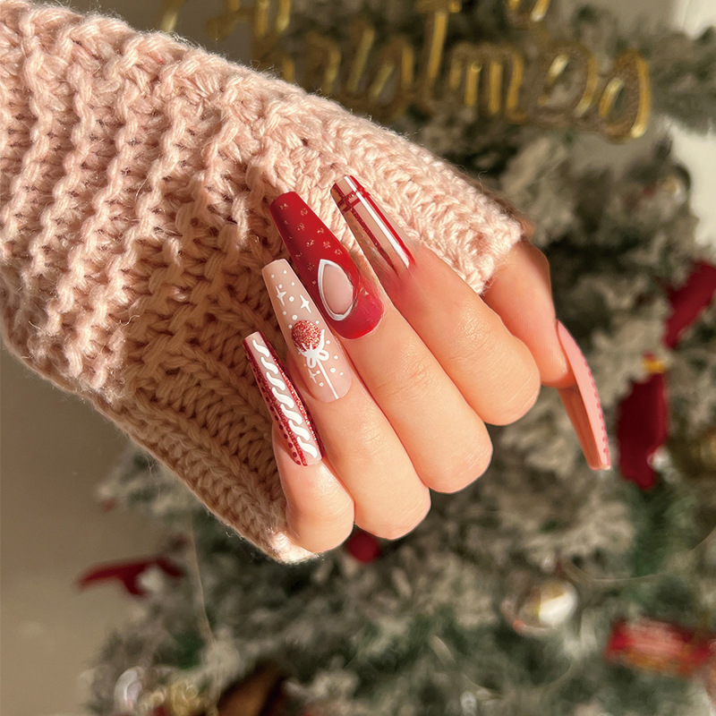 穿戴式美甲批发长款芭蕾磨砂圣诞爱心闪粉美甲片成品可拆卸高级