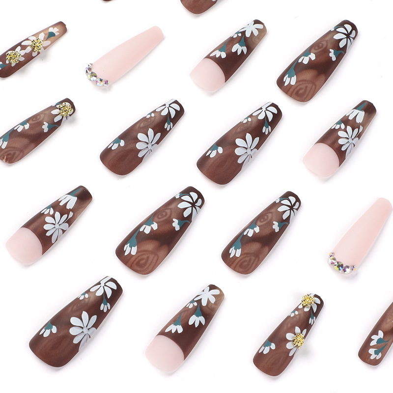 / 美甲甲片批发棕色木纹磨砂穿戴甲甲片批发白色小花绿叶小金珠水钻