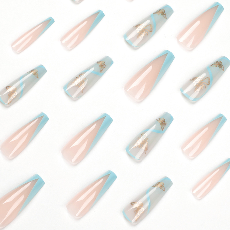 甲片成品批发蓝色线条金线蝴蝶美甲片成品可拆卸press on nails cantidad