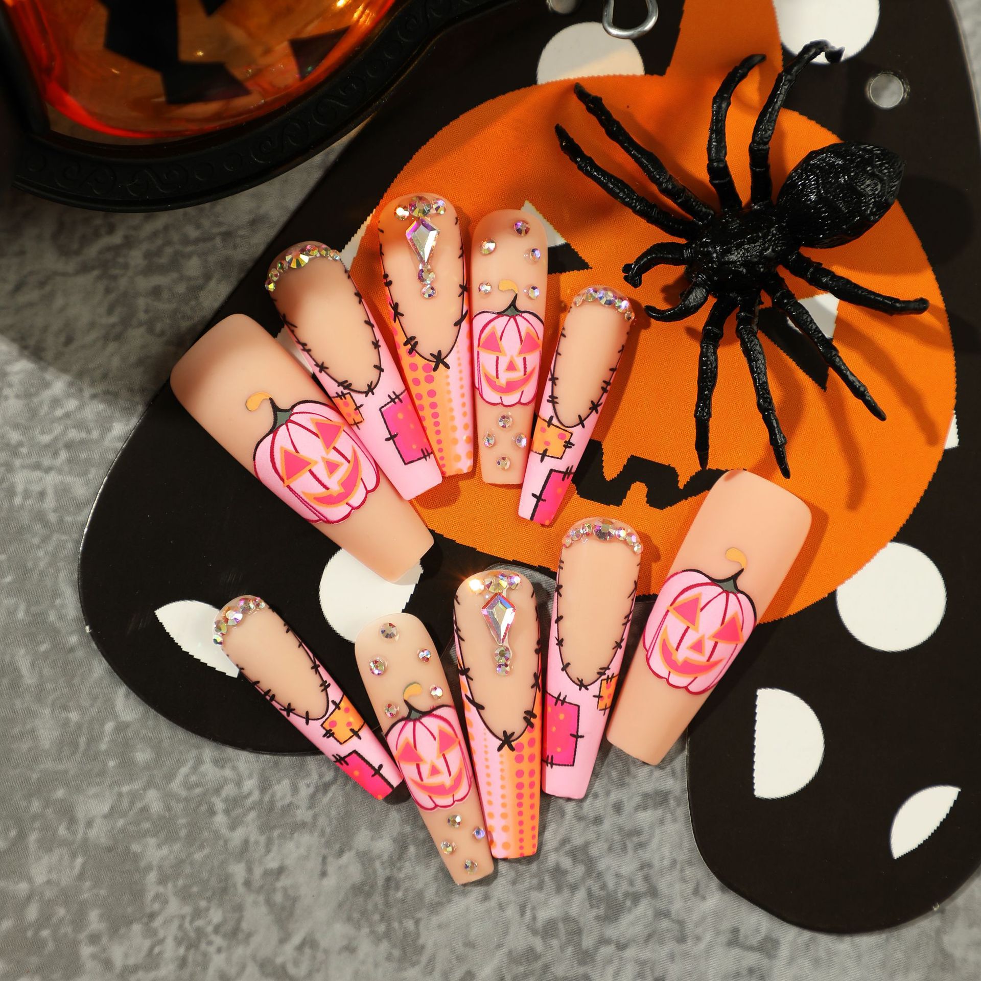 穿戴甲批发万圣节磨砂美甲粉色法式南瓜水钻波点美甲片美甲成品