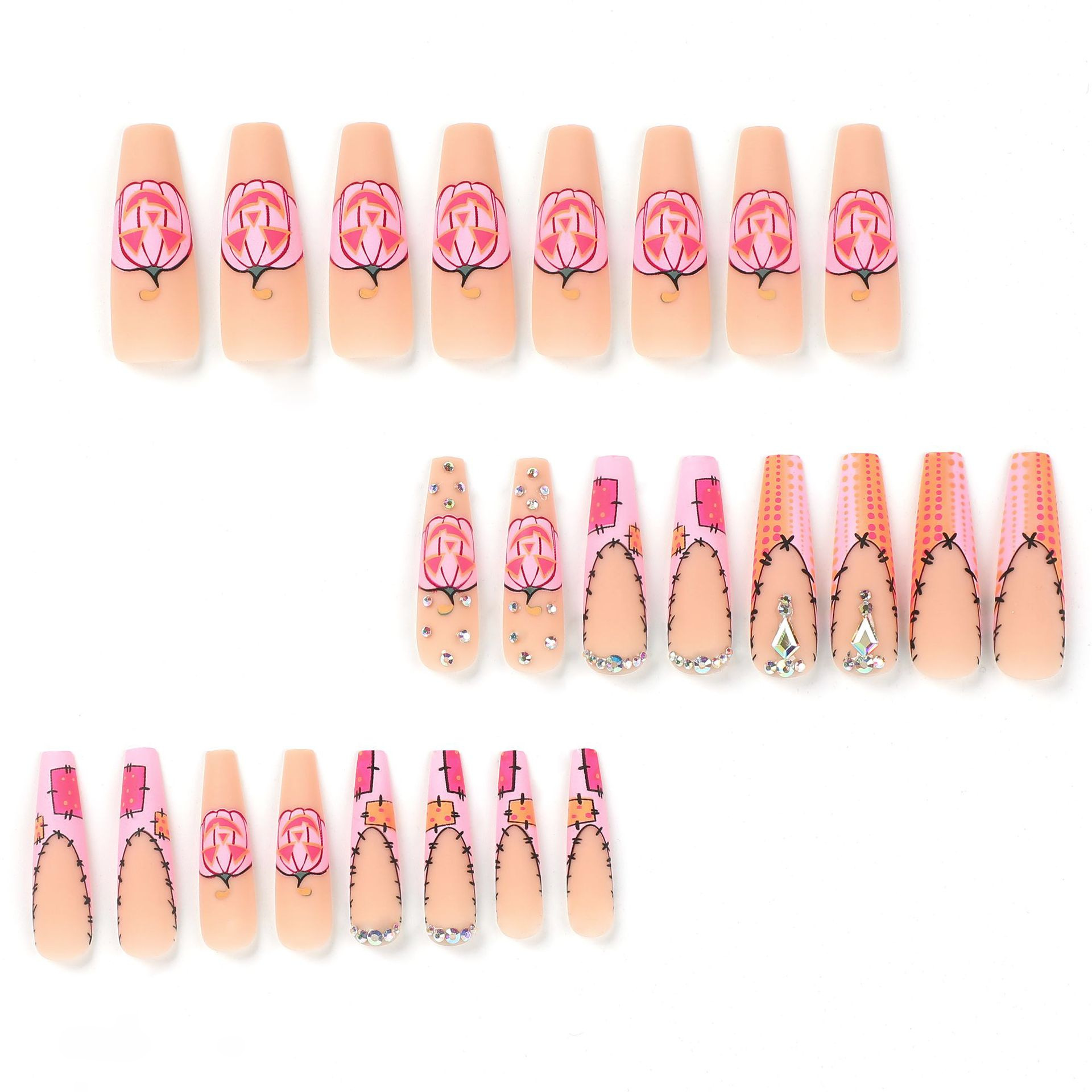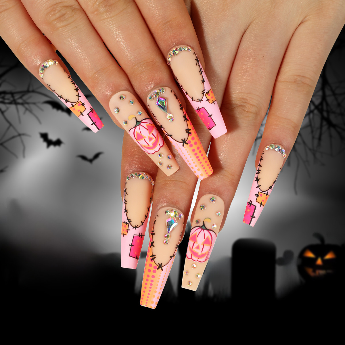 穿戴甲批发万圣节磨砂美甲粉色法式南瓜水钻波点美甲片美甲成品 cantidad