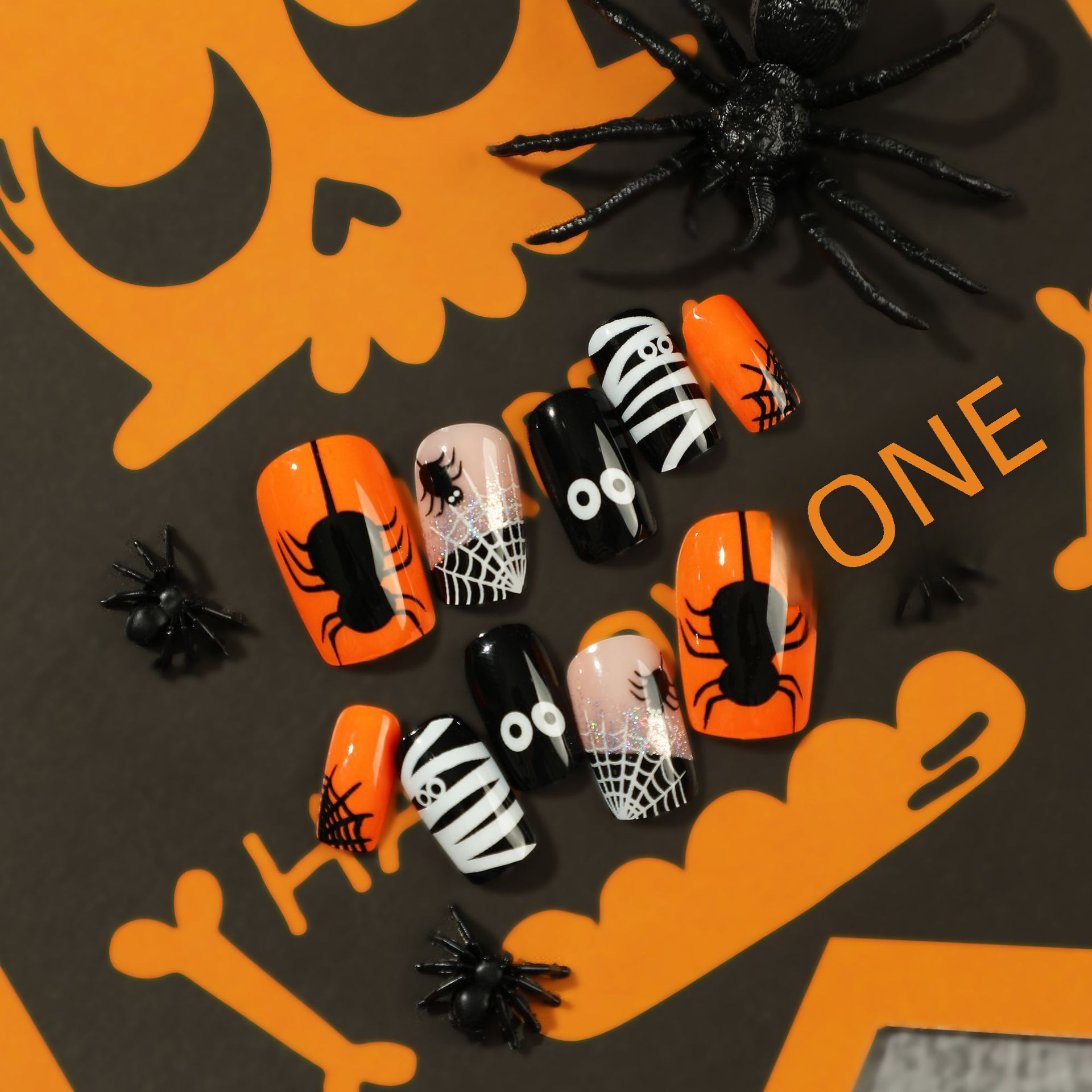 Desgaste de uñas al por mayor de Halloween Nail Art Araña Negro Blanco Tela de araña de dibujos animados Ojo de cuentas Nail Art Pieza Nail Art Acabado de uñas