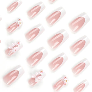 粉色可爱美甲穿戴甲片蝴蝶结甲片美甲片批发中长款花朵指甲贴批发