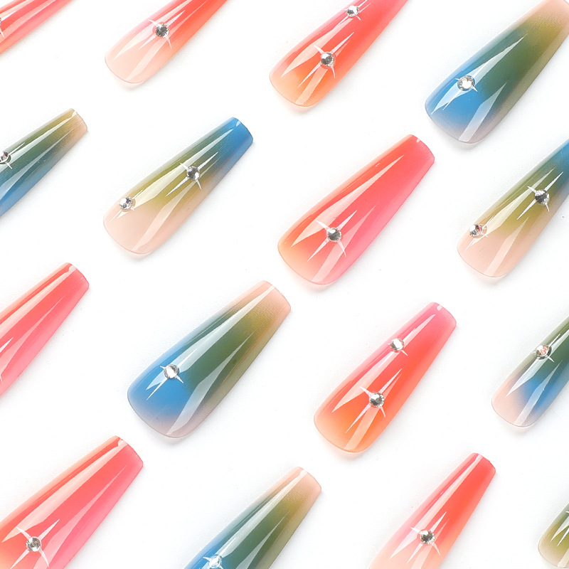 美甲穿戴甲蓝绿晕染穿戴甲长款红黄晕染水钻美甲甲片成品假指甲 cantidad