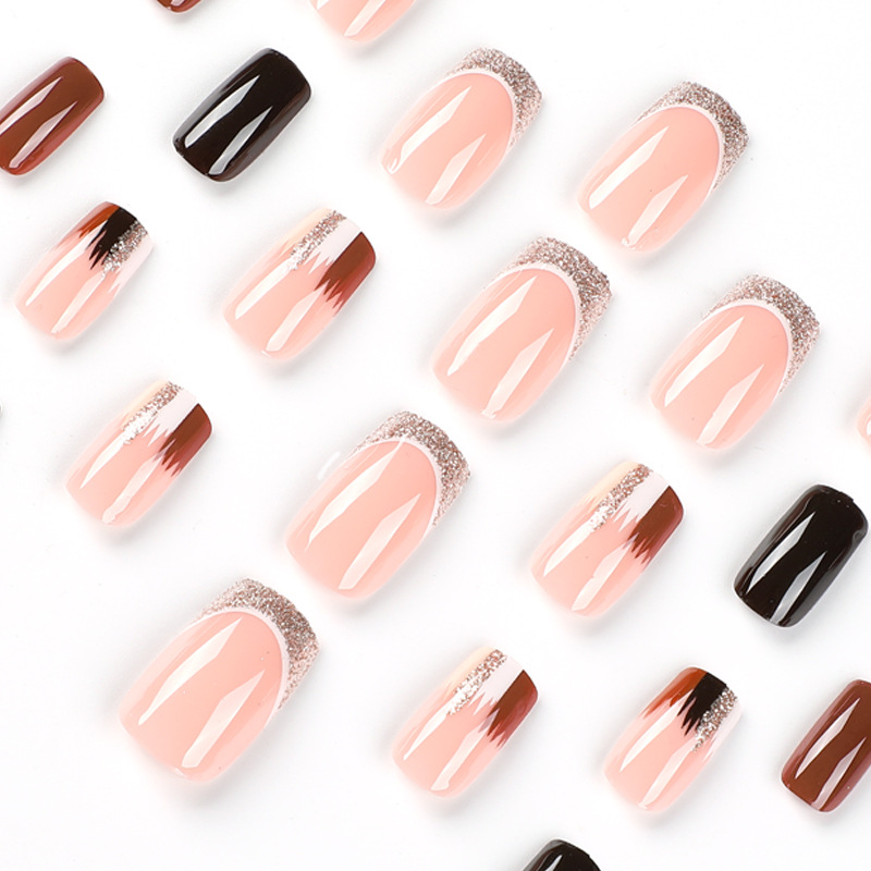 美甲贴片穿戴甲棕色渐变欧美穿戴甲金色闪粉法式边穿戴甲甲片批发 cantidad