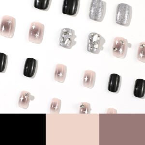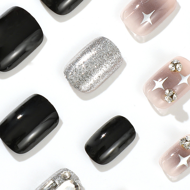 / 穿戴式指甲贴黑色银色闪粉星芒腮黑水钻短款穿戴甲美甲成品假指甲