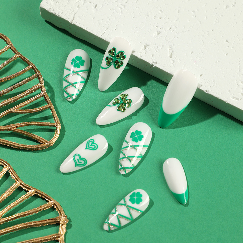 穿戴甲甲片圣帕特里克节美甲绿色水钻爱心四叶草 press on nail