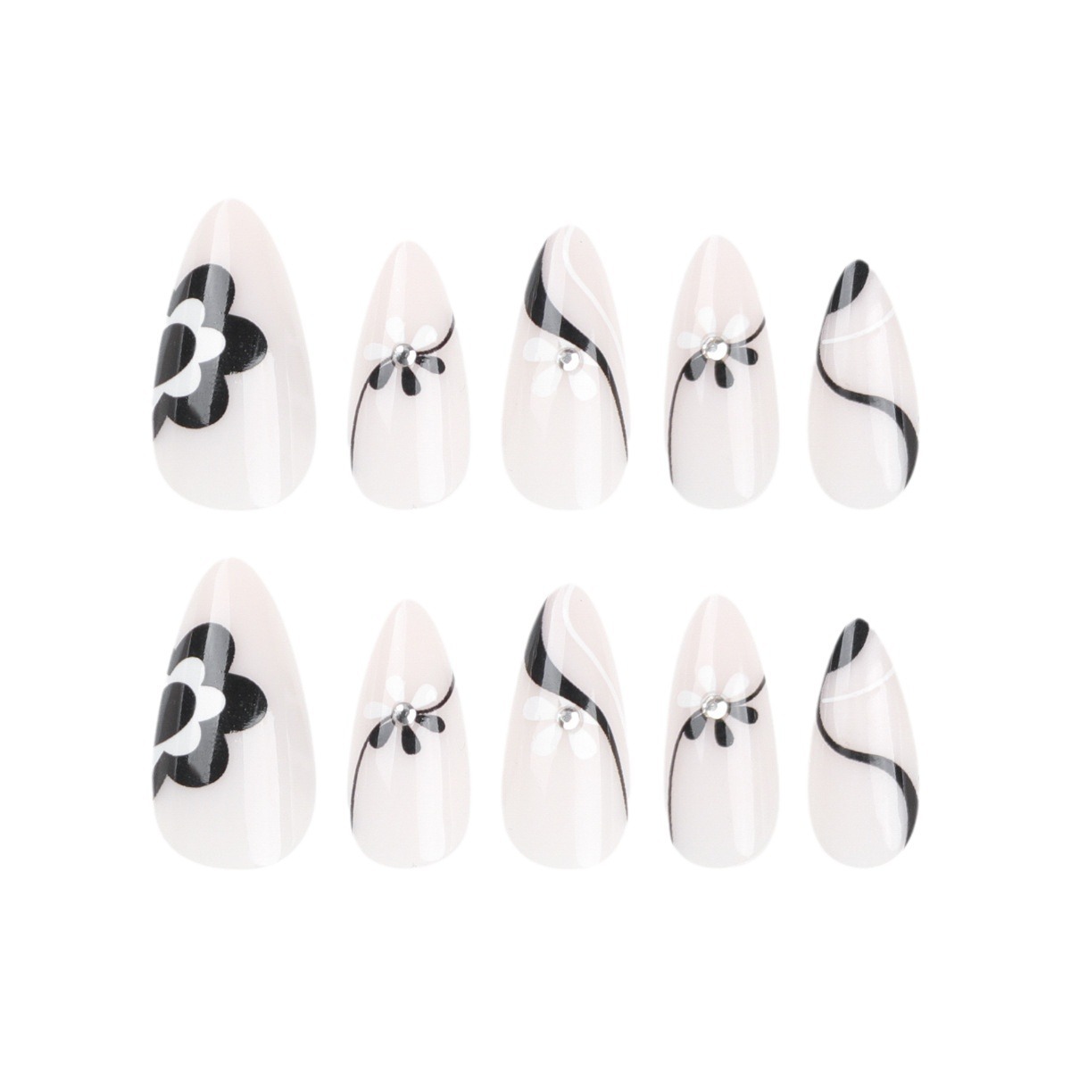 quantité de 黑白拼接花朵穿戴甲点钻黑色条纹美甲片短款杏仁甲可拆卸甲片批发