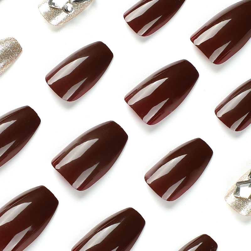 quantité de 美甲穿戴甲甲片酒红色金色闪粉水钻美甲甲片批发指甲贴片批发nail