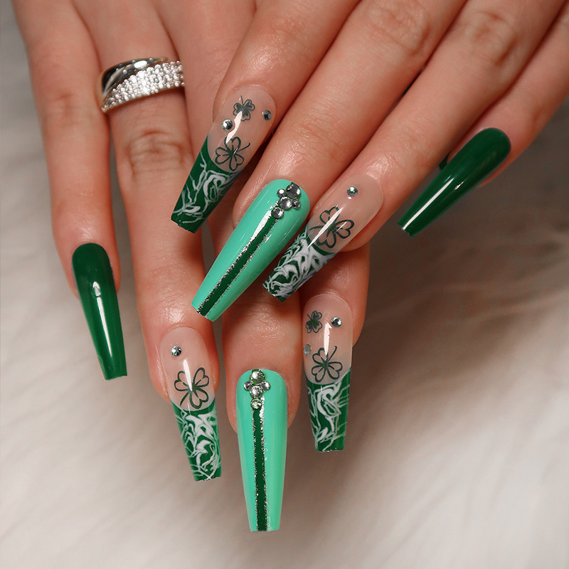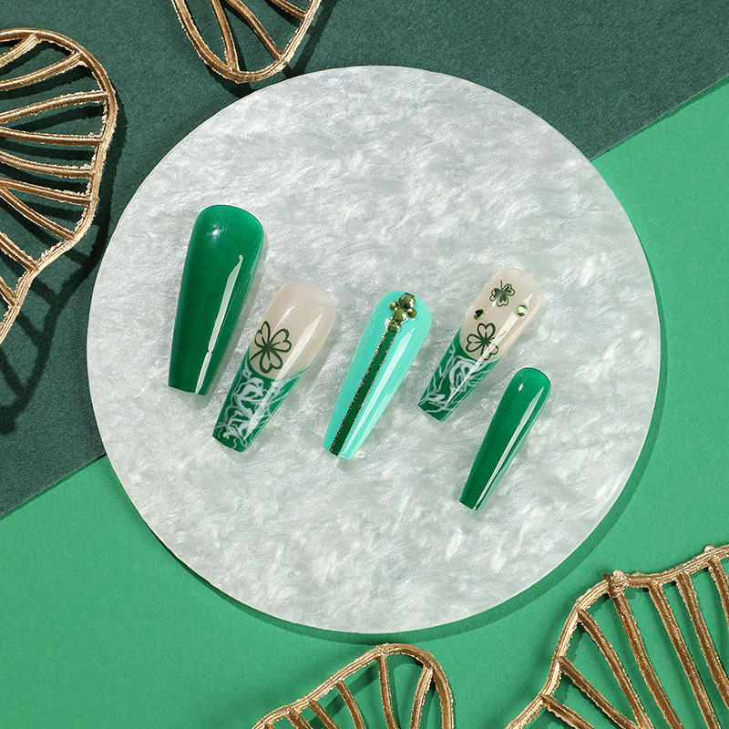 quantité de 穿戴甲长款圣帕特里克节水钻四叶草甲片批发美甲穿戴甲批发nails