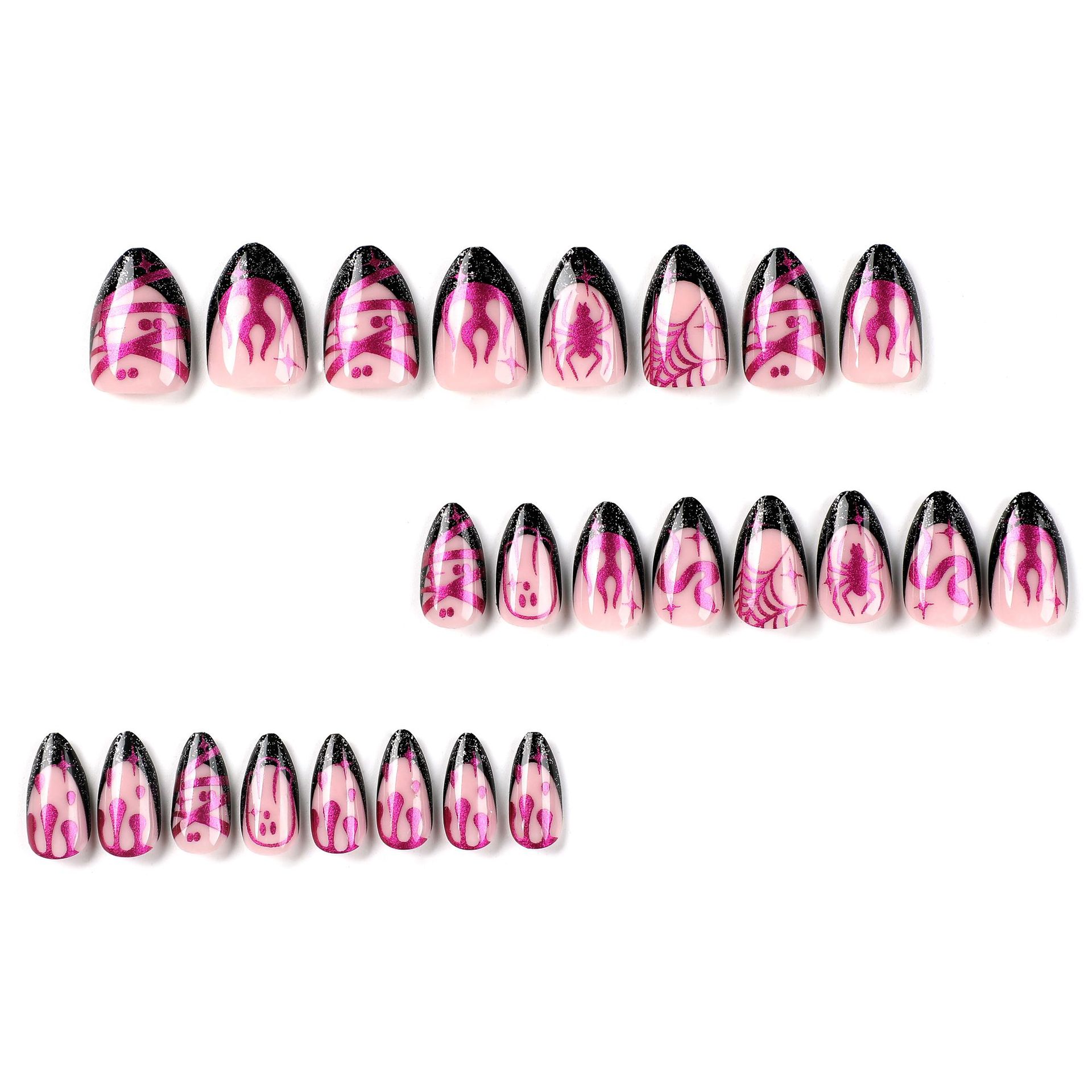 quantité de 穿戴美甲万圣节黑法式指甲贴片闪粉紫色火焰蜘蛛甲片蛛网星芒蛇