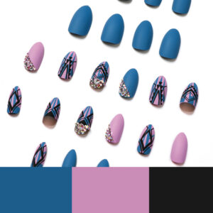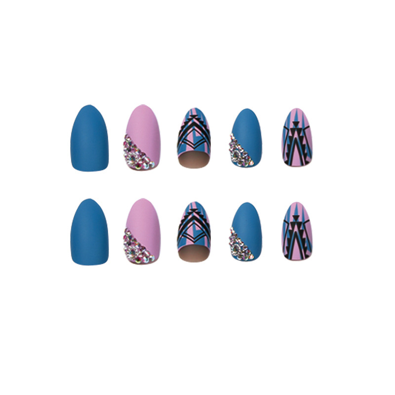 甲片成品批发磨砂蓝紫撞色假指甲片批发几何图案水钻甲片成品批发