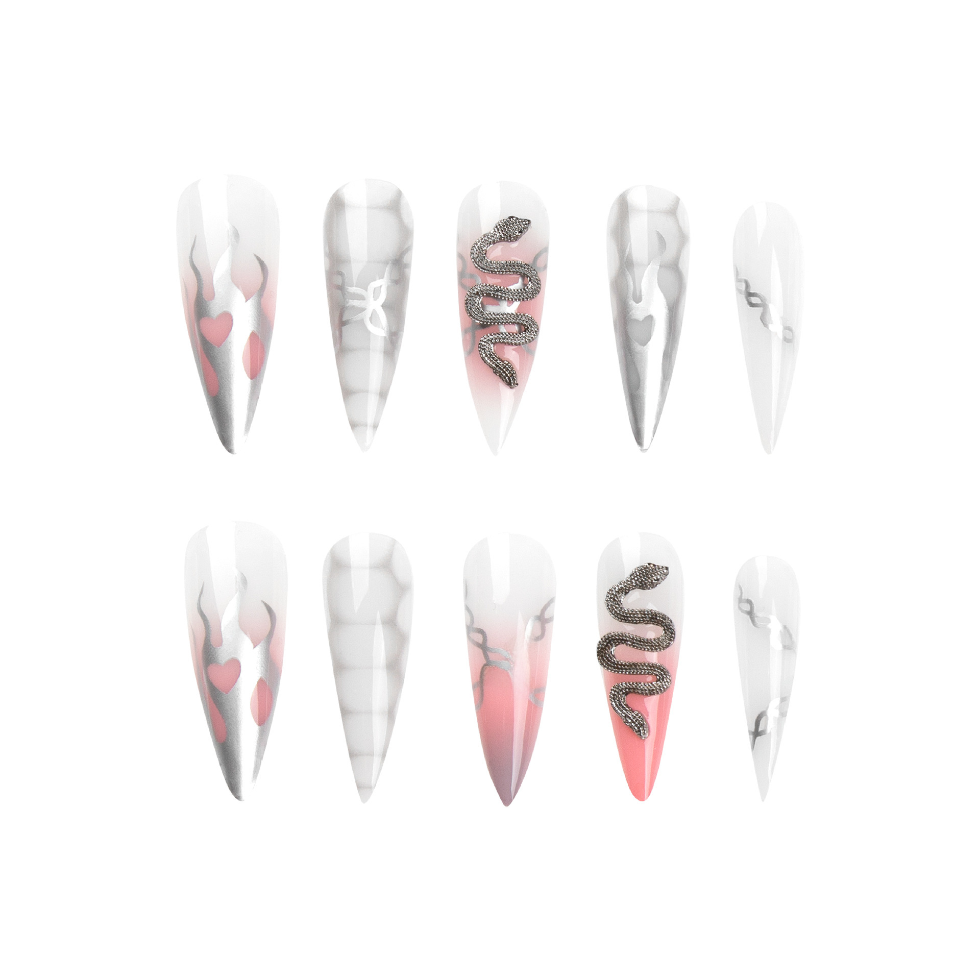 穿戴式指甲贴银色火焰锁链粉色晕染蛇形图案水钻美甲片可拆卸nail個