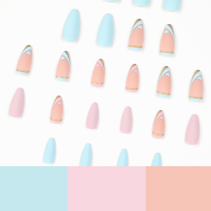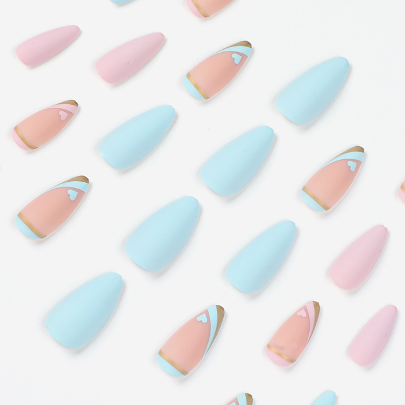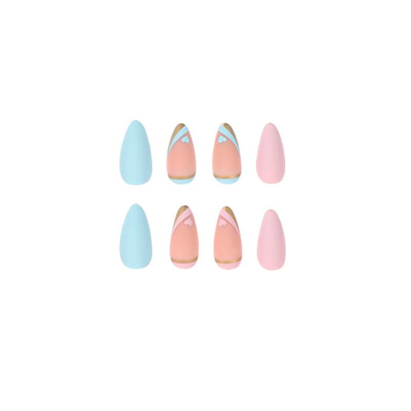 / 穿戴甲片批发蓝色鸳鸯法式 穿戴甲爱心金边美甲穿戴甲批发中长款