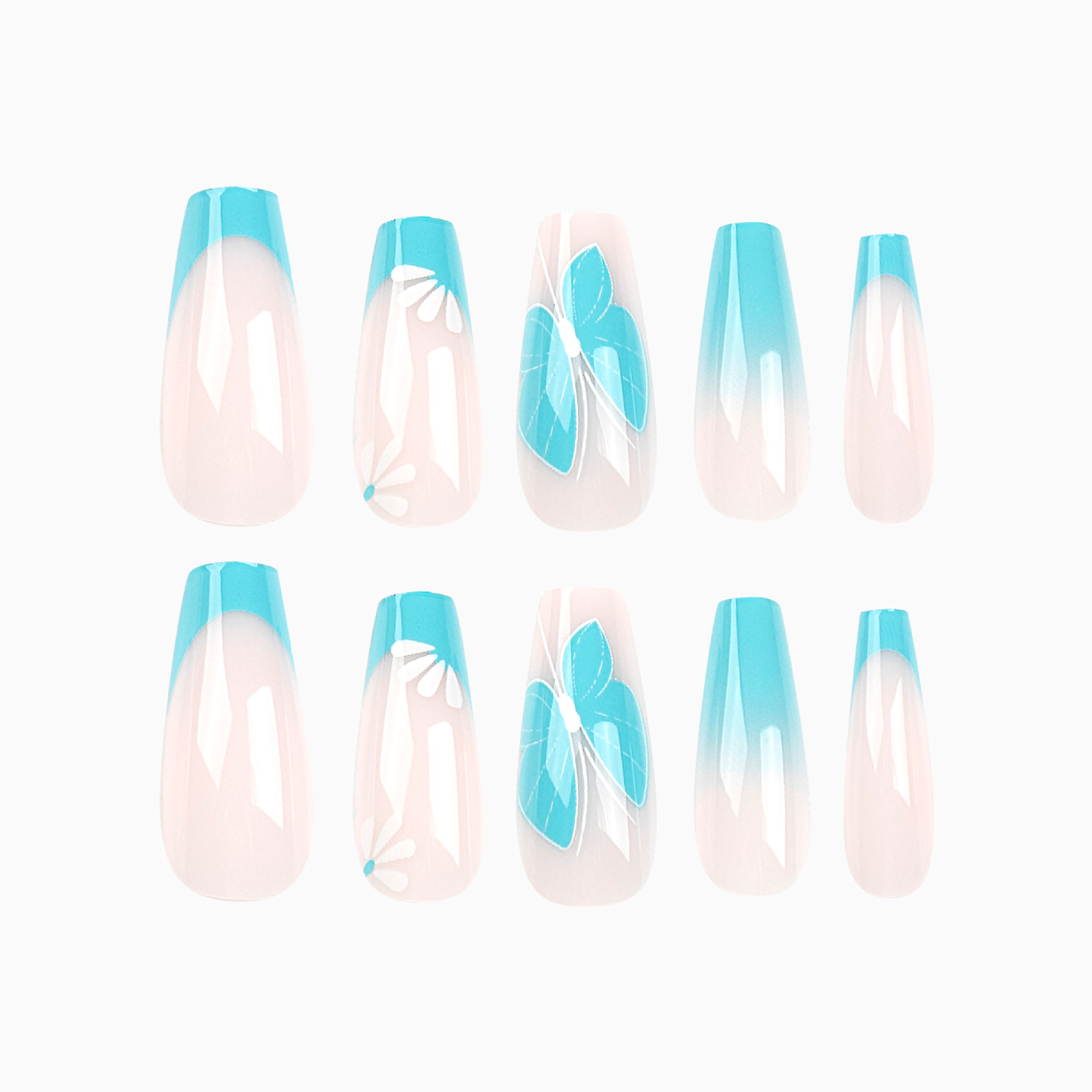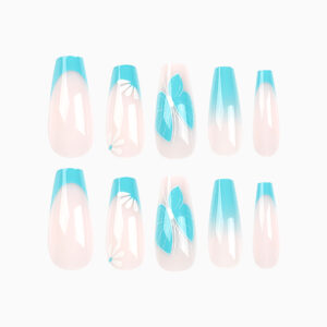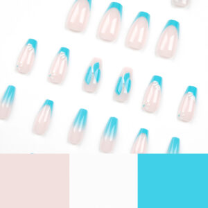 / 穿戴式指甲片蓝色法式美甲片成品蓝色渐变蝴蝶白色花朵贴片美甲