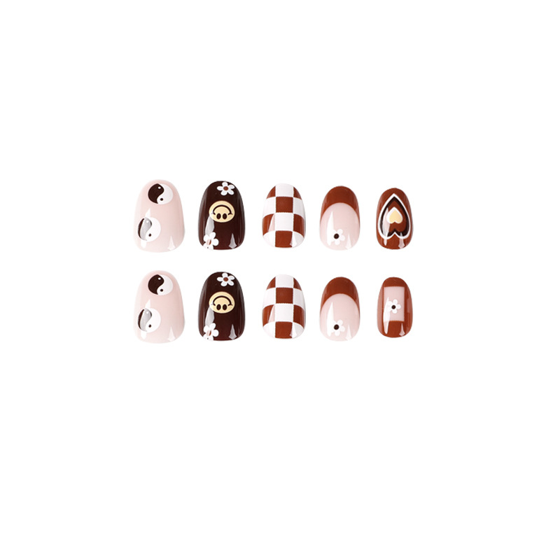 / 穿戴甲短款复古棕棋盘格爱心小花甲片贴卡通笑脸甜酷穿戴甲秋冬