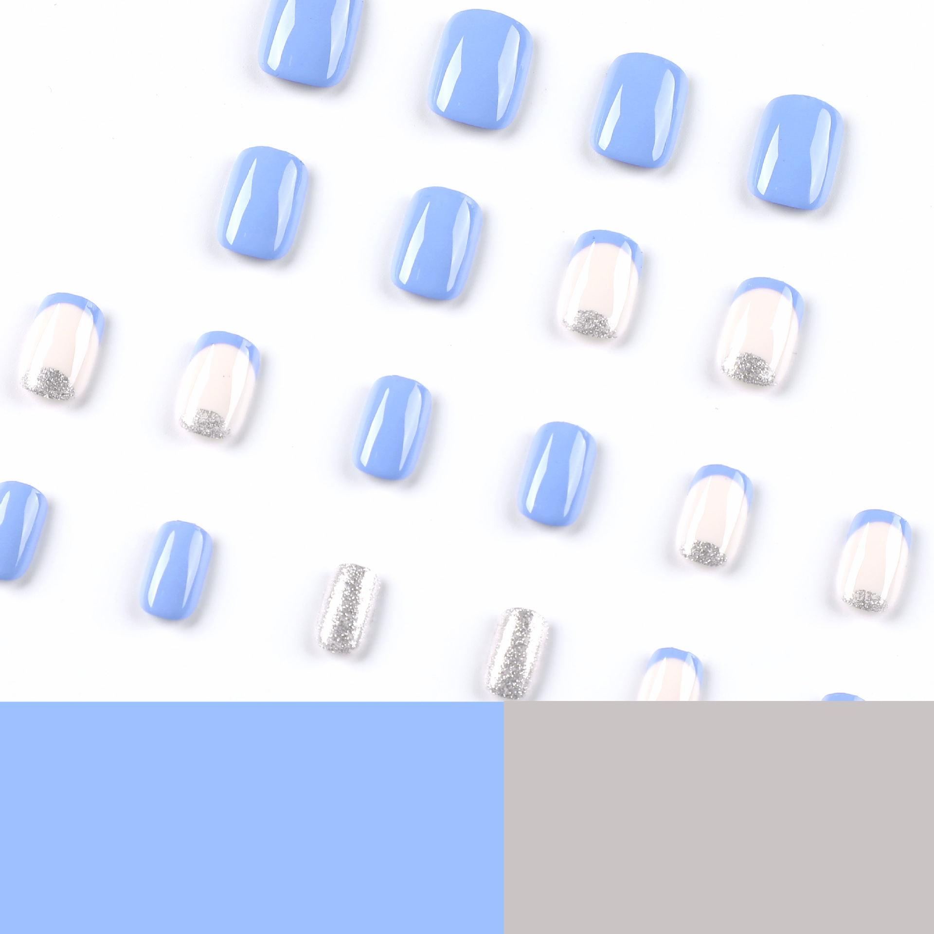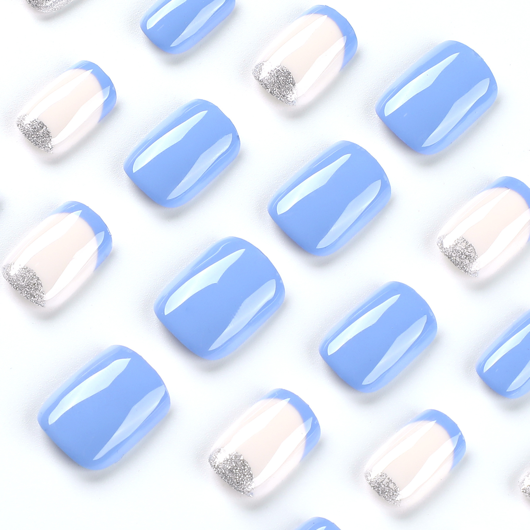 / 穿戴甲短款甲片蓝白撞色美甲片蓝色法式银色闪粉假甲片可穿戴甲片