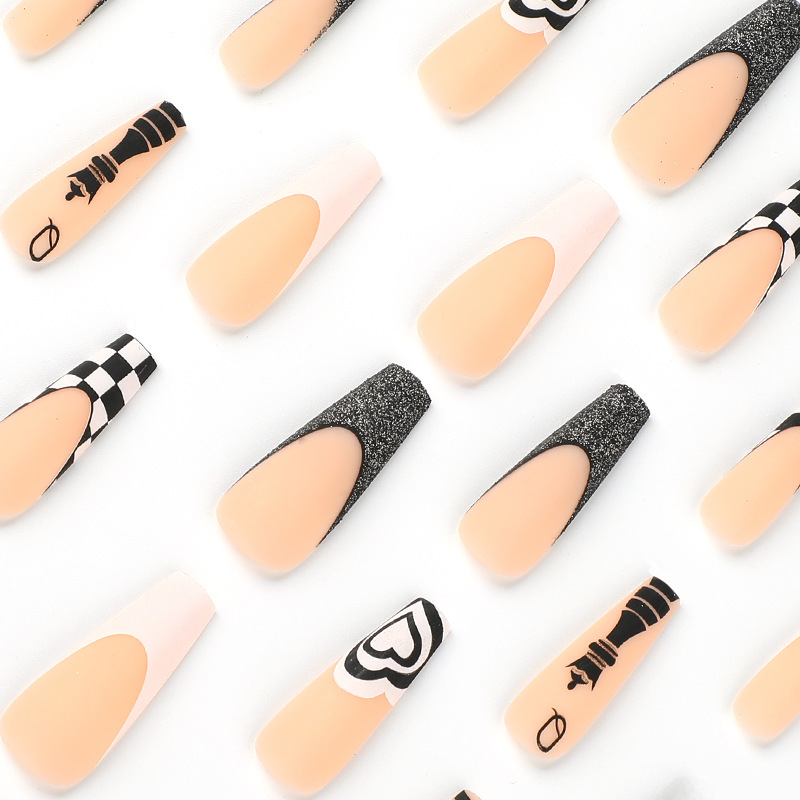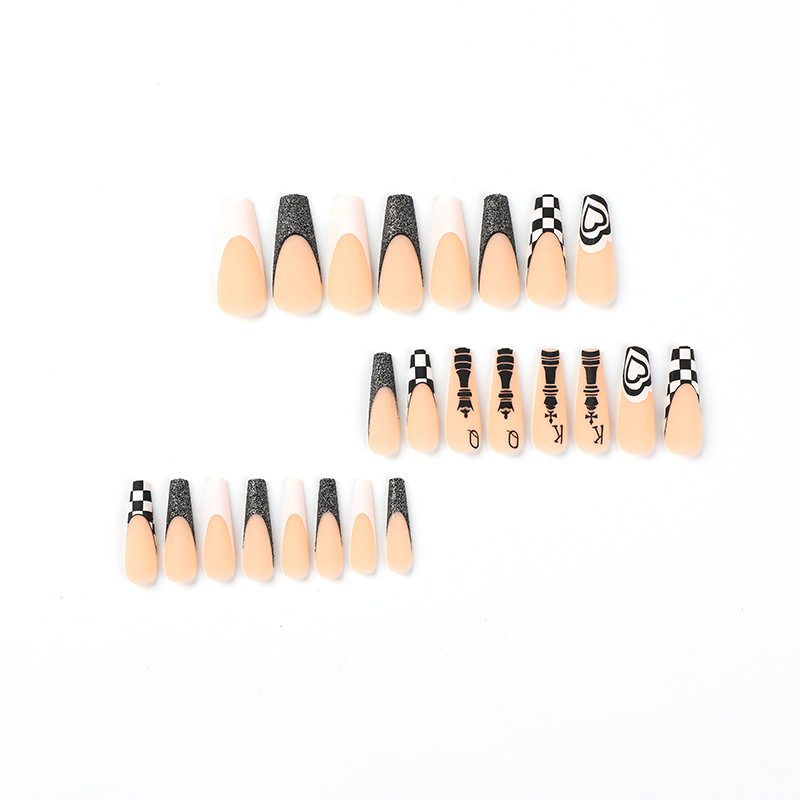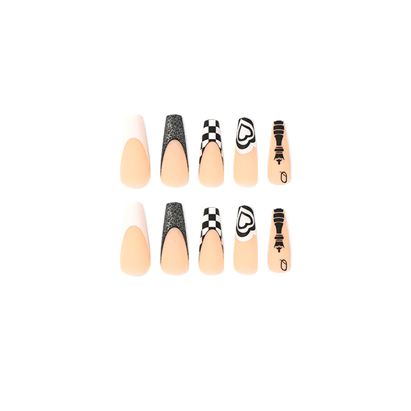 穿戴美甲成品批发黑白棋盘格爱心闪粉穿戴美甲长款press on nails 수량