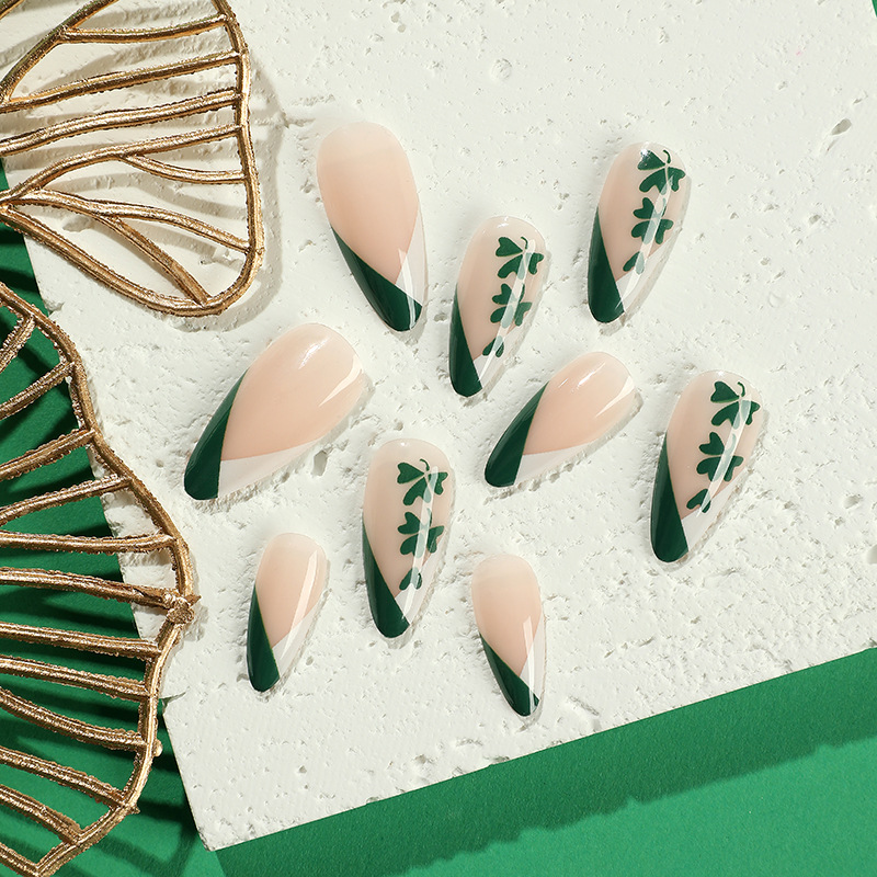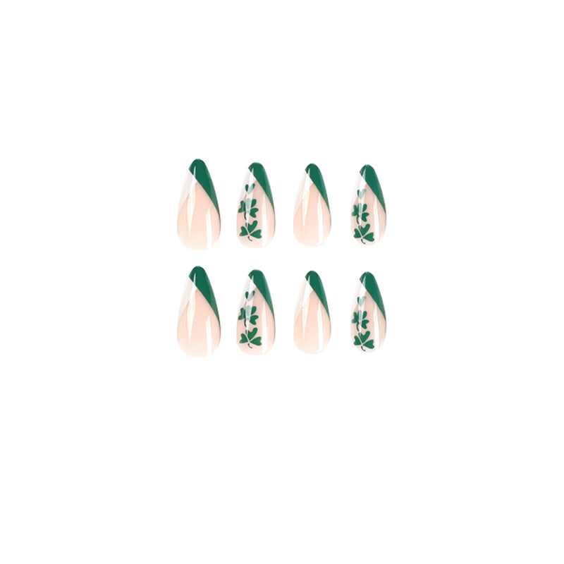 穿戴美甲批发圣帕特里克节美甲绿法边式四叶草甲片press on nails 수량