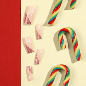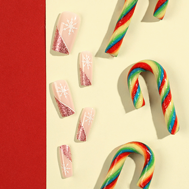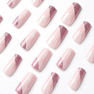 美甲穿戴甲批发中长款粉色闪粉斜边法式白色雪花 press on nails 수량