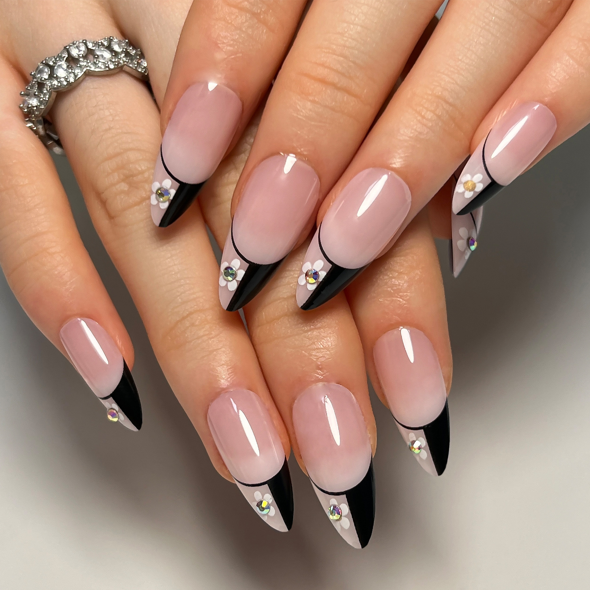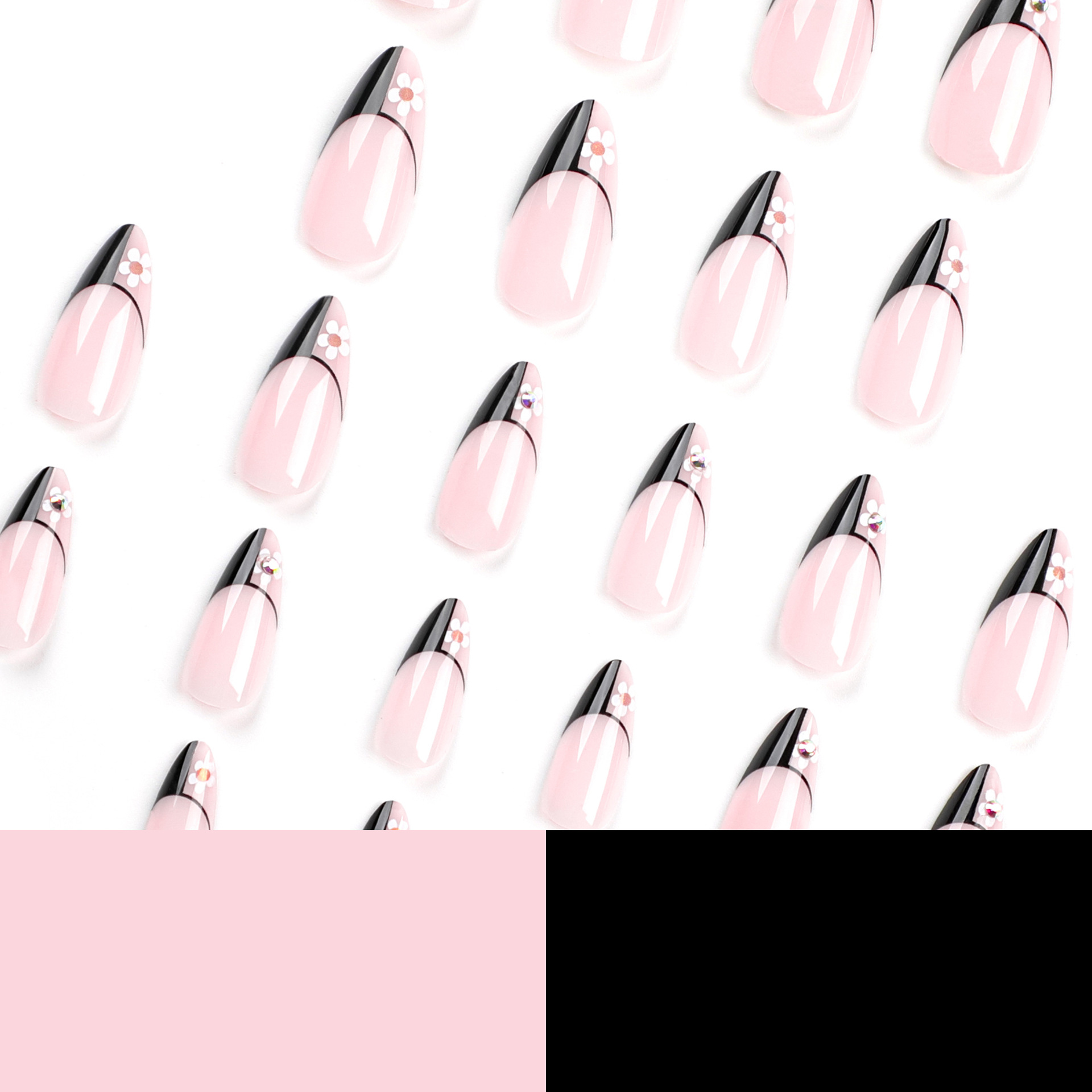 / 法式几何黑色拼接美甲贴片花朵杏仁甲点钻穿戴甲穿戴式甲片nails
