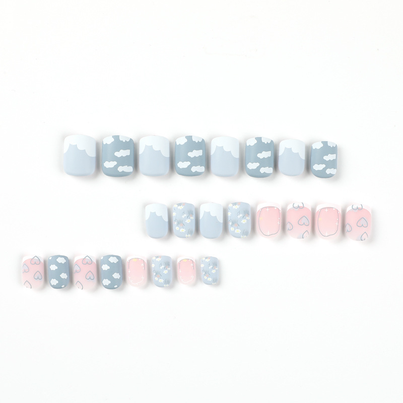 穿戴甲成品磨砂蓝色云朵指甲贴片批发爱心清新小花可拆卸美甲nail