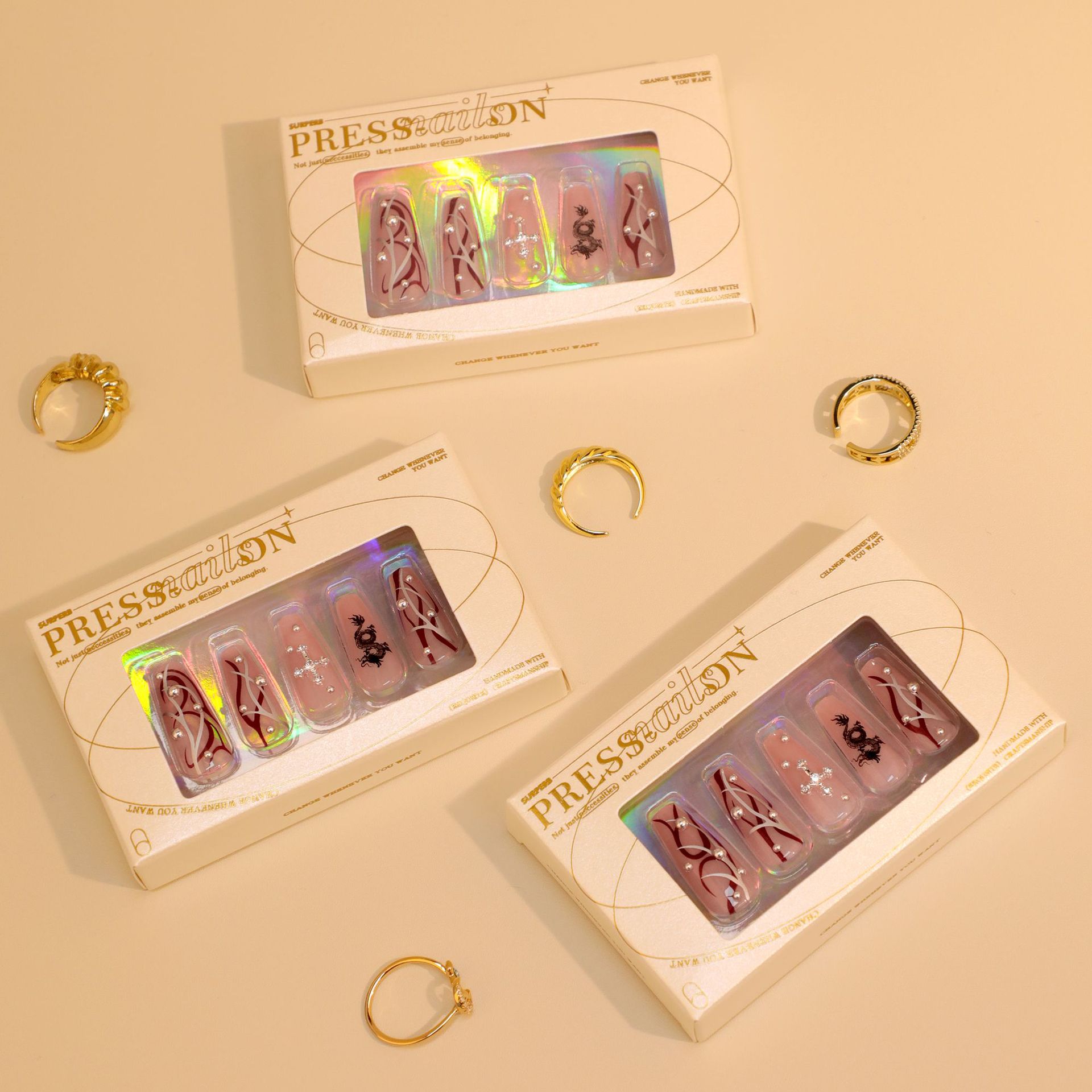 / 新年中国龙国潮风美甲片十字架点钻穿戴甲中长款芭蕾甲假指甲批发