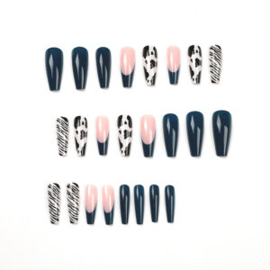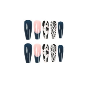 穿戴甲批发蓝色长芭蕾指甲贴片黑白奶牛纹线条可拆卸美甲穿戴甲片