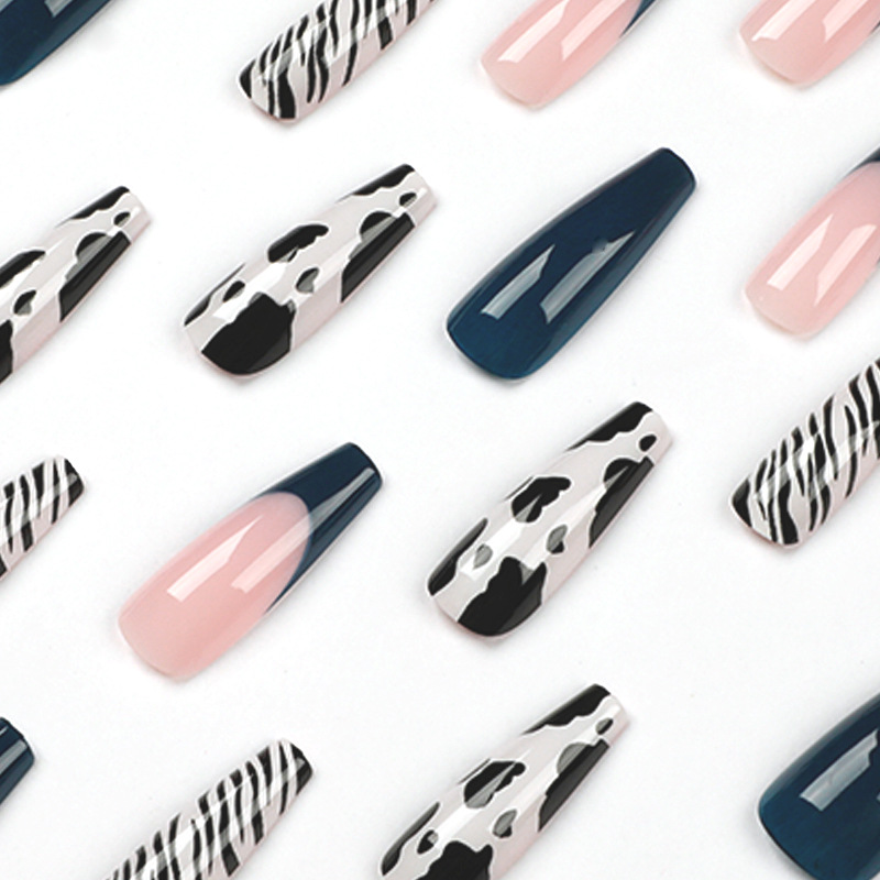 / 穿戴甲批发蓝色长芭蕾指甲贴片黑白奶牛纹线条可拆卸美甲穿戴甲片