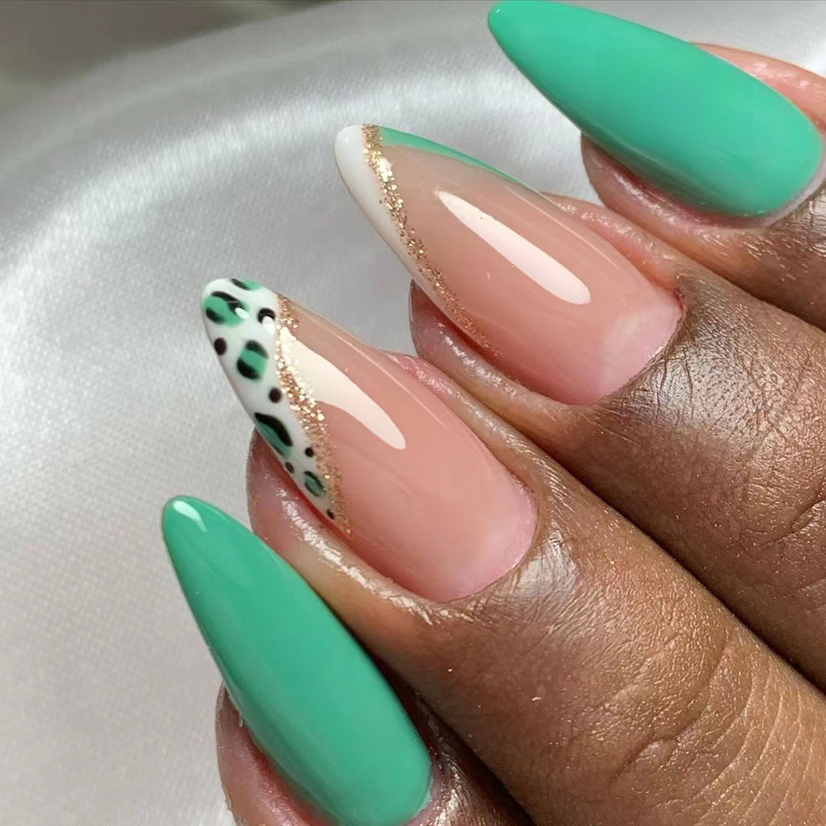 穿戴甲金色闪粉法式白边绿色拼接美甲新款成品杏仁甲甲片工厂批发