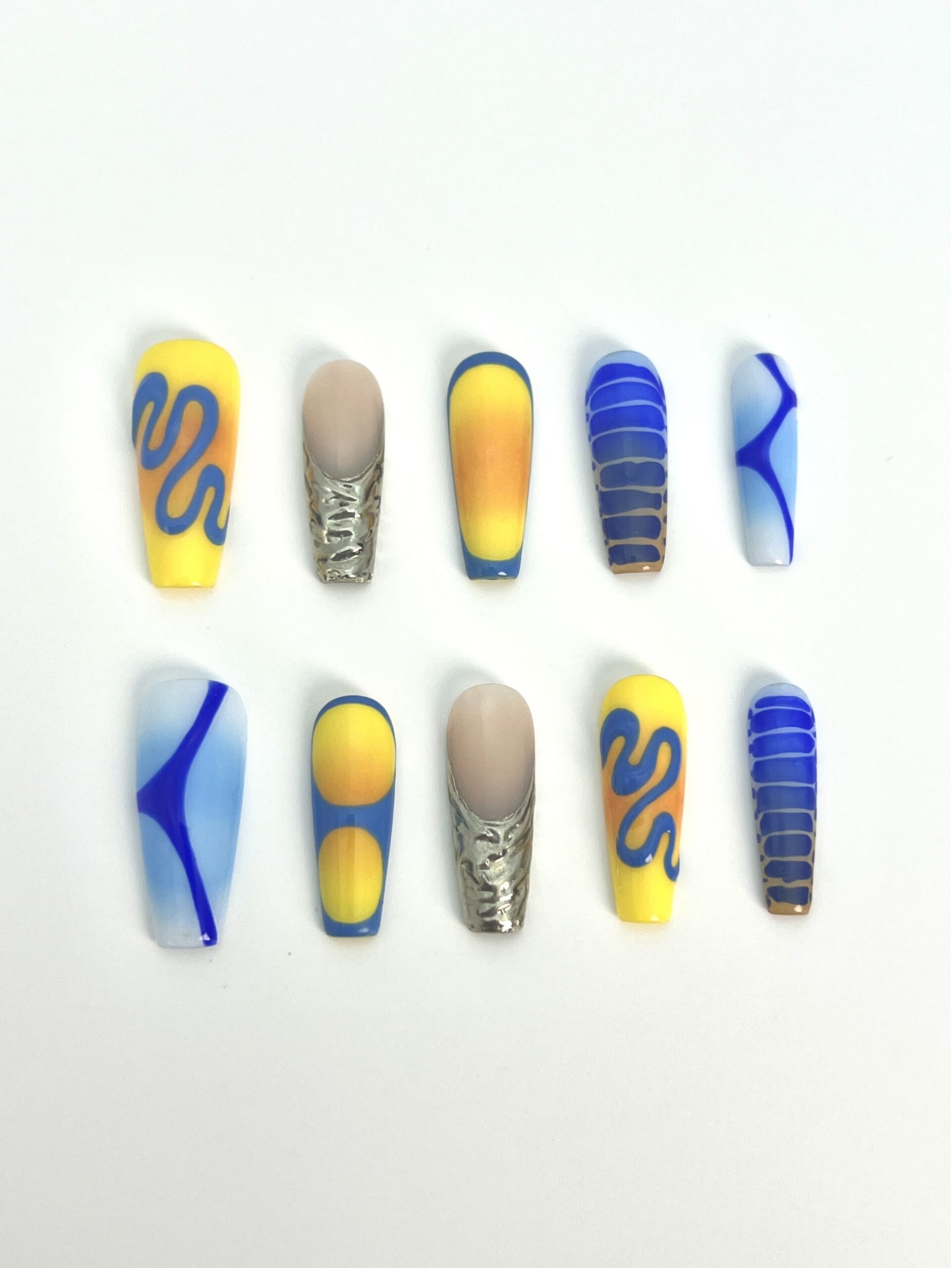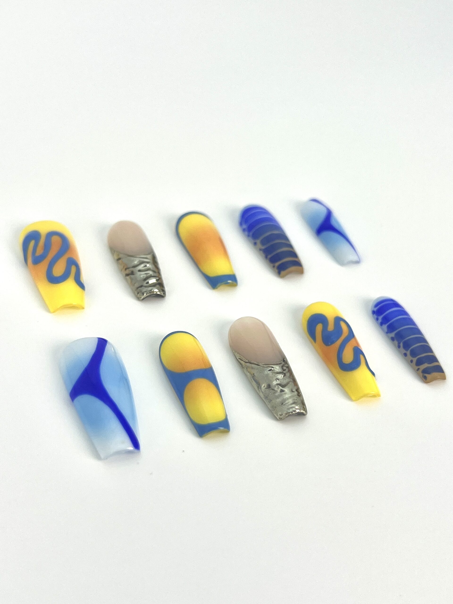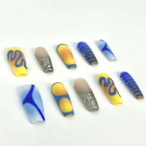 / 黄蓝交织渐变搭配独特线条图案,色彩鲜明且设计新颖的穿戴甲,适合追求个性的消费者,跨境热卖支持批发