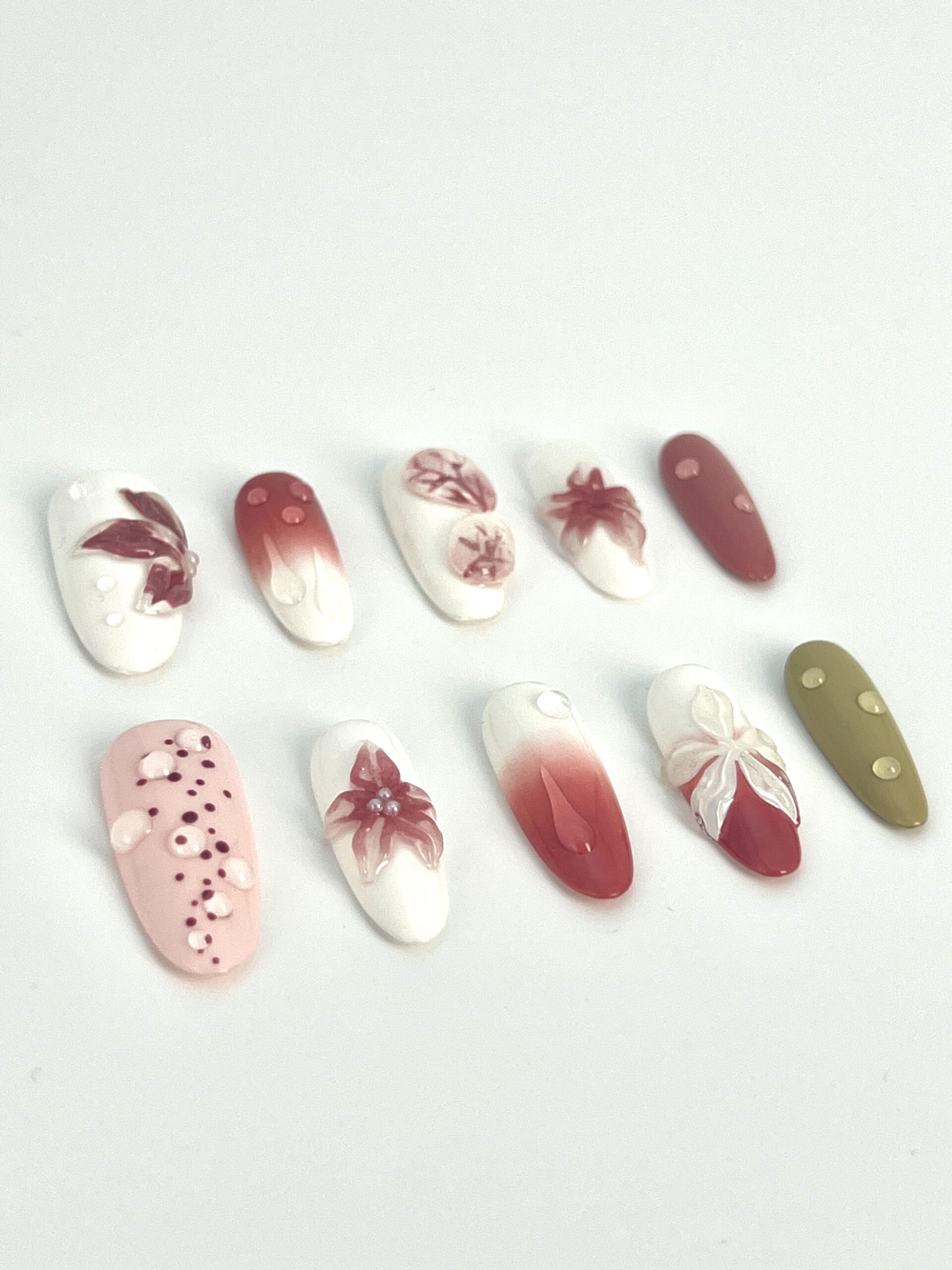 红白绿等颜色搭配叶子和花朵,富有自然美感且设计独特的穿戴甲,支持批量订购,适合个性需求
