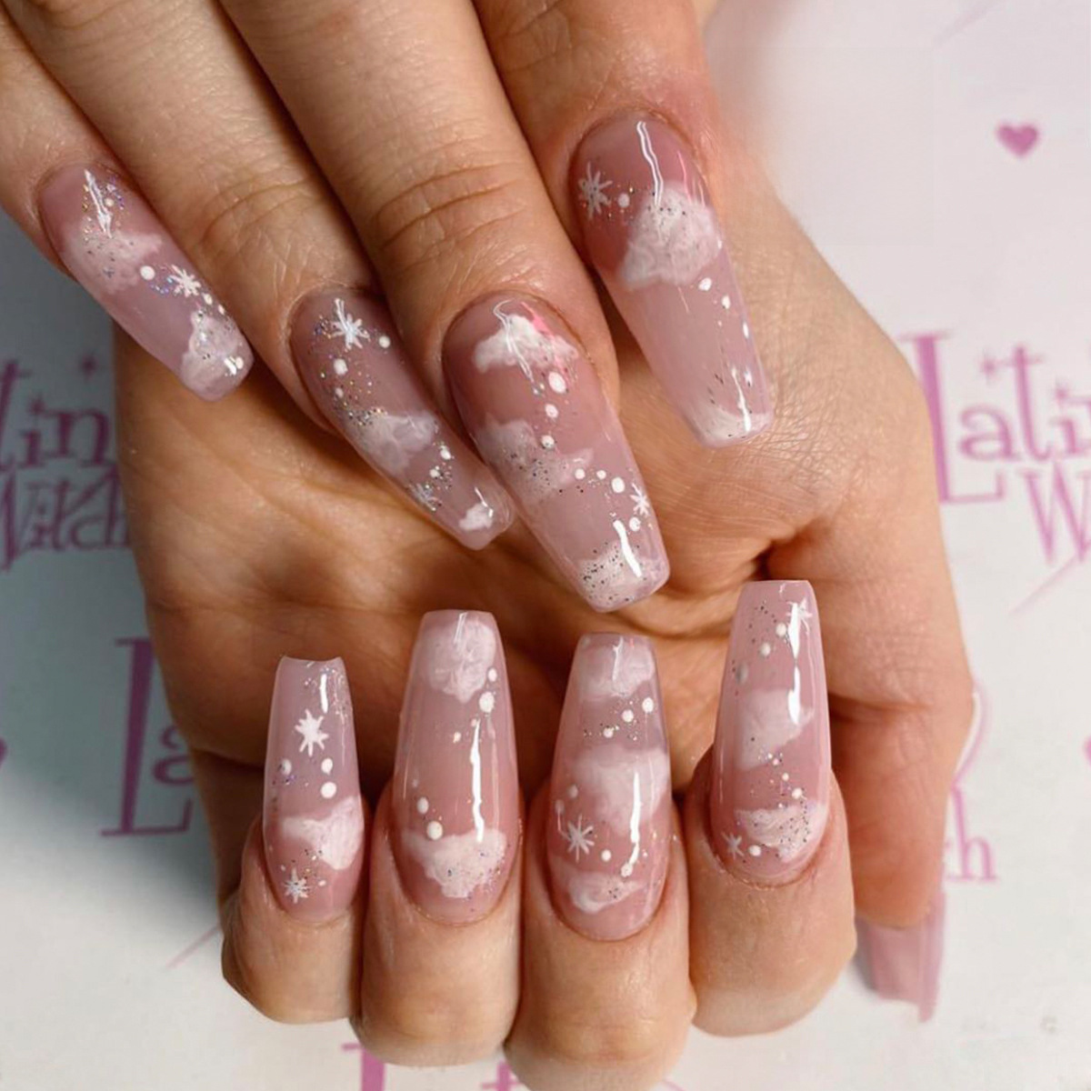 / 长芭蕾裸色透粉云朵穿戴美甲防水假指甲美甲贴片可拆卸指甲贴片