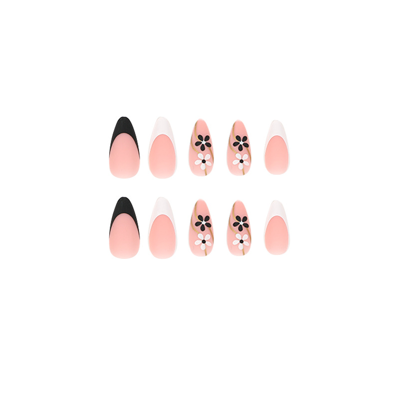/ 甜酷穿戴甲秋冬小花穿戴甲 法式黑白拼色指甲贴片批发甲片穿戴甲