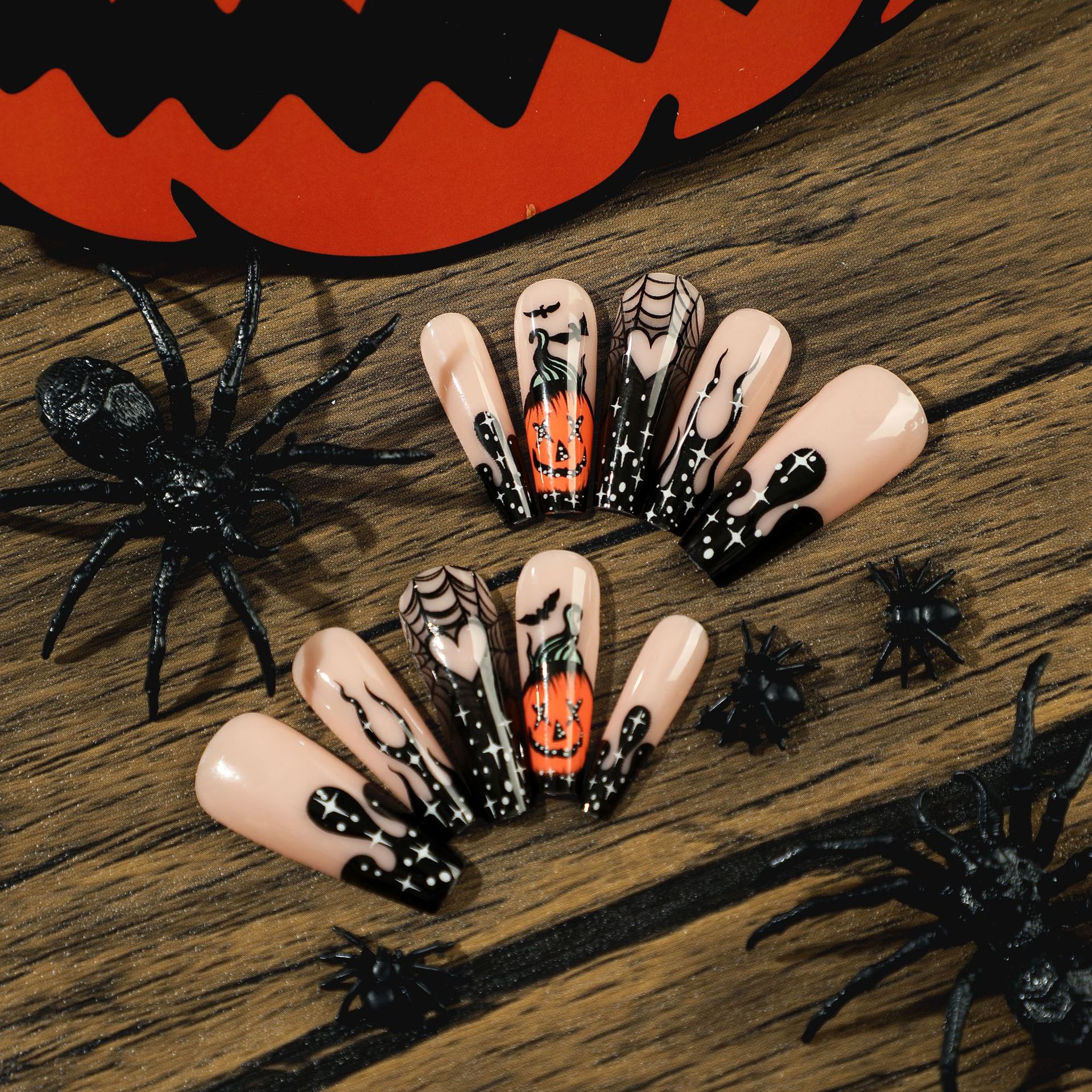 穿戴假甲片万圣节美甲黑色法式火焰爱心蛛网南瓜蝙蝠穿戴式指甲片