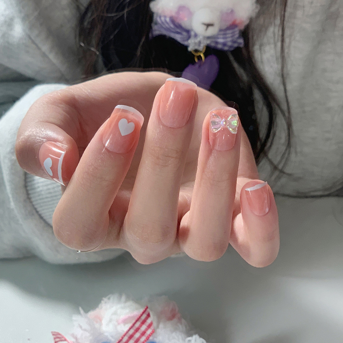 Pink Translucent Cream Blue Heart Bowknot Wearable Nail Art Fake Nail Nail Art Patch Nail Patch Removível