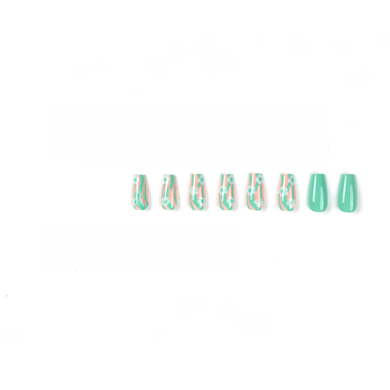 / 美甲穿戴甲批发短款绿色波浪白色小花穿戴式美甲nail甲片穿戴甲片