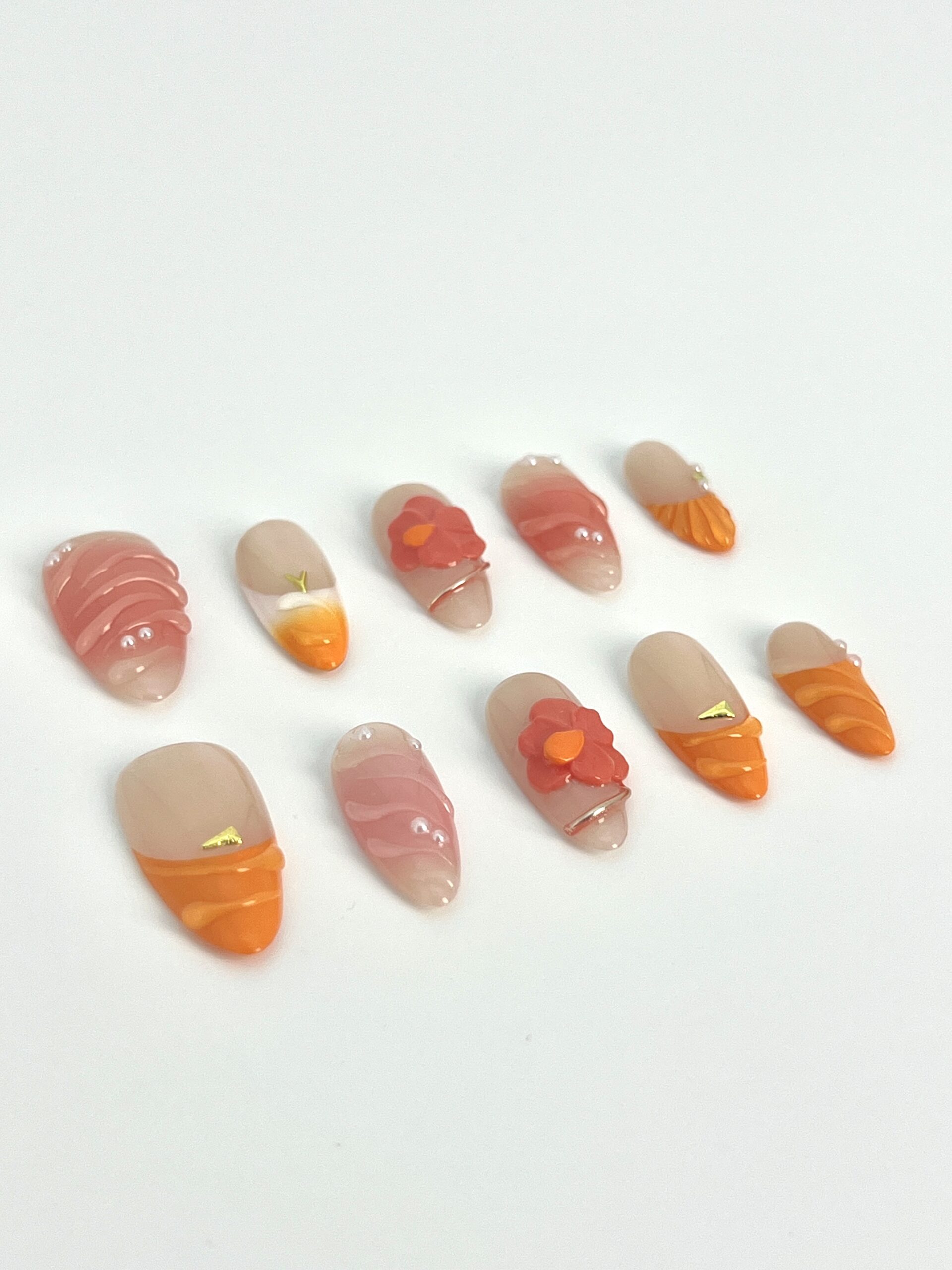 Rosa, laranja e outras misturas multicoloridas, com flores e decorações de pérolas, unhas requintadas para uso doce, show de estilo romântico, venda quente internacional com suporte para atacado