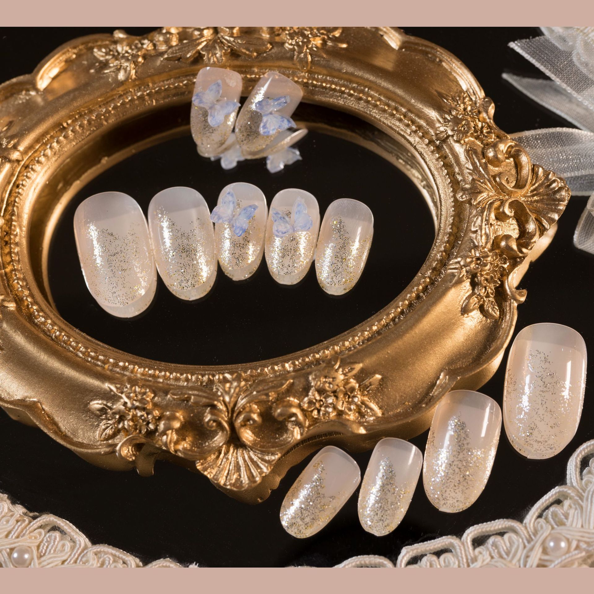 闪粉尖头蝴蝶穿戴甲成品美甲贴片假指甲网红蝴蝶防水指甲片可拆卸