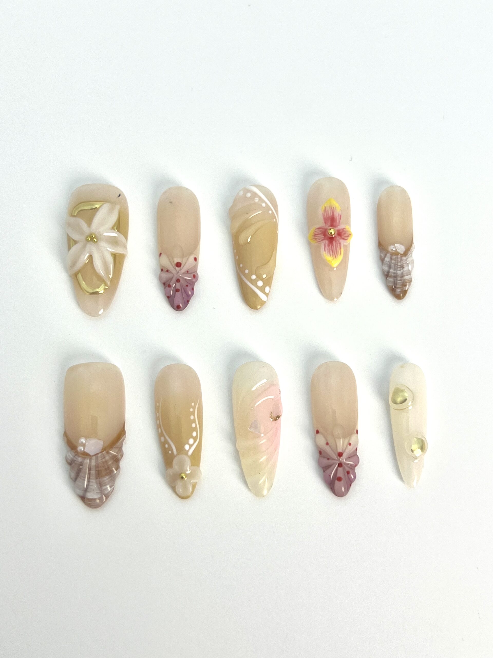 Base bege decorada com flores e conchas, unhas naturais e detalhadas que podem ser usadas, elegantes e adequadas para compras em grandes quantidades